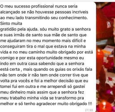 Faço e desfaço qualquer tipo de trabalho espiritual. Com a força dos meus guias e dos orixás, tenho certeza que posso te ajudar. Não trabalho com falsas promessas. A força dos caboclos e dos pretos velhos estão junto comigo nessa caminhada espiritual. São Miguel Arcanjo é a nossa defesa.